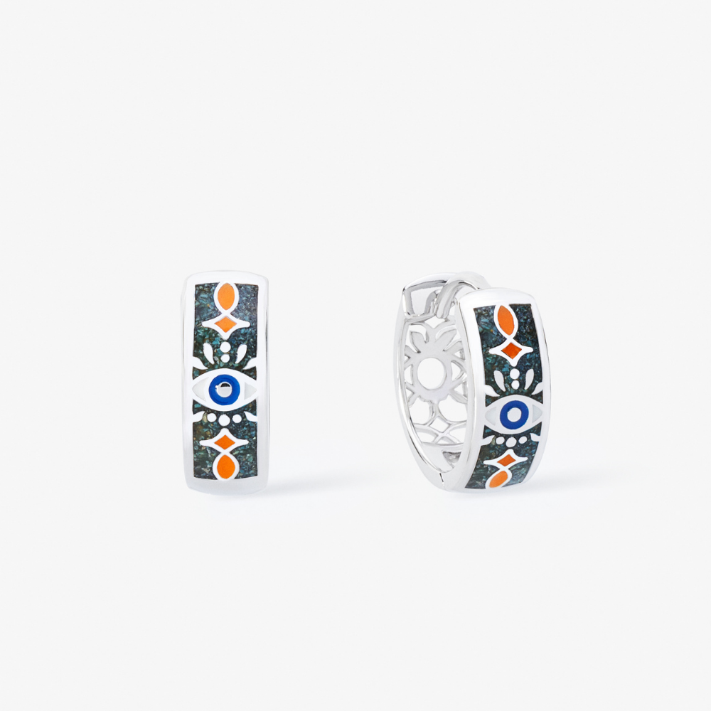 The Hamsa with Eye design in sterling silver features crushed mosaic inlay combined with enamel, carefully arranged to create a symbolic, protective surface. Finished with rhodium plating for enhanced brightness and lasting durability.